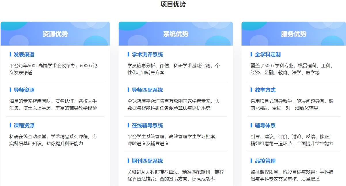 服务支持保障:拥有全球智库海量专家资;6000+发表渠道资源;学术测评系统、导师匹配系统、在线辅导系统、论文投稿系统等技术支持。