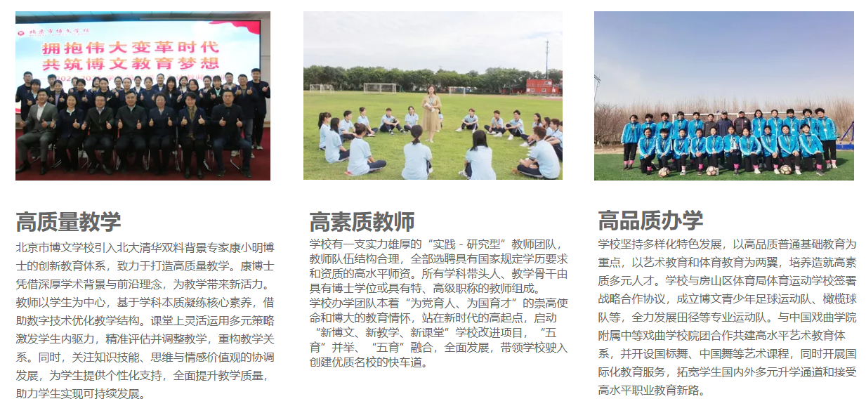 学校坚持多样化特色发展,以高品质普通基础教育为重点,以艺术教育和体育教育为两翼,培养造就高素质多元人才。学校与房山区体育局体育运动学校签署战略合作协议,成立博文青少年足球运动队、橄榄球队等,全力发展田径等专业运动队。与中国戏曲学院附属中等戏曲学校院团合作共建高水平艺术教育体系,并开设国标舞、中国舞等艺术课程,同时开展国际化教育服务,拓竞学生国内外多元升学通道和接受高水平职业教育新路。