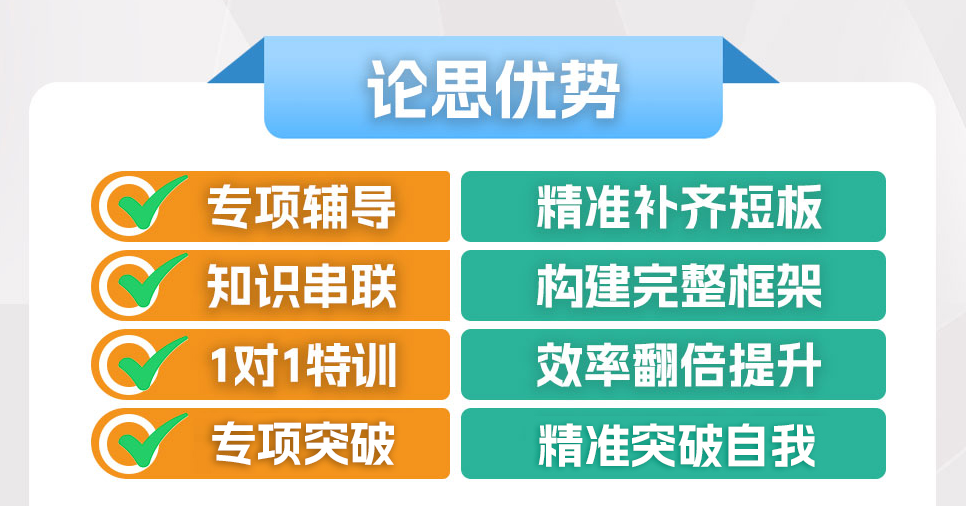 “论当下,思未来”,论思教育继承了状元密训班的教学传统,诚信选名师,用心做教育,是一家师资强、提分快、口碑好的课外辅导学校;论思十年磨一剑,沉淀众多提分课程,如“中高考全托管集训”“暑假学霸集训”、“一轮跟踪外训”、“考前八次速成”、“寒假十天特训”、“艺考文化课全托管集训”、“百日全托管集训”、“考前押题集训”等一系列的初高课程,力求帮助不同个性的孩子,让他们在最后的基础教育生涯学习中短时间突破自我,创造辉煌人生。